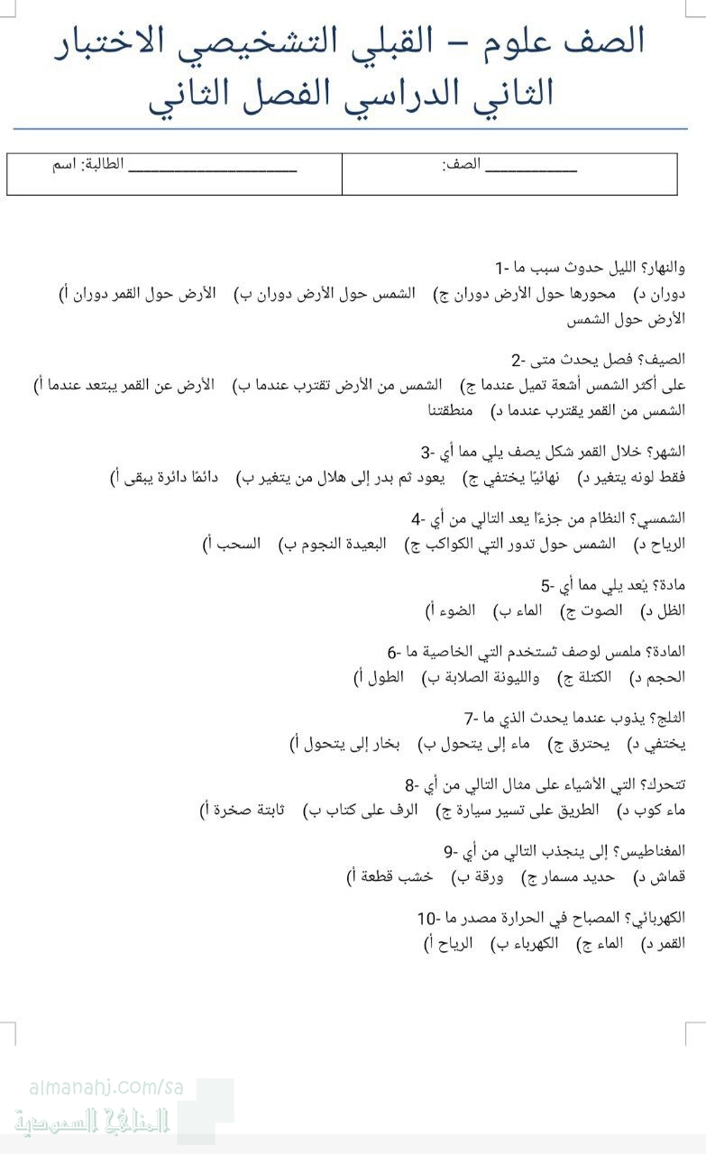 14. الصف الثاني, علوم, الاختبار التشخيصي القبلي المفاهيم الأساسية