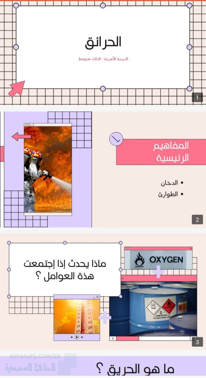 9. الصف الثالث المتوسط, تربية أسرية, عرض تقديمي عن مسببات الحرائق ووسائل الوقاية والسلامة