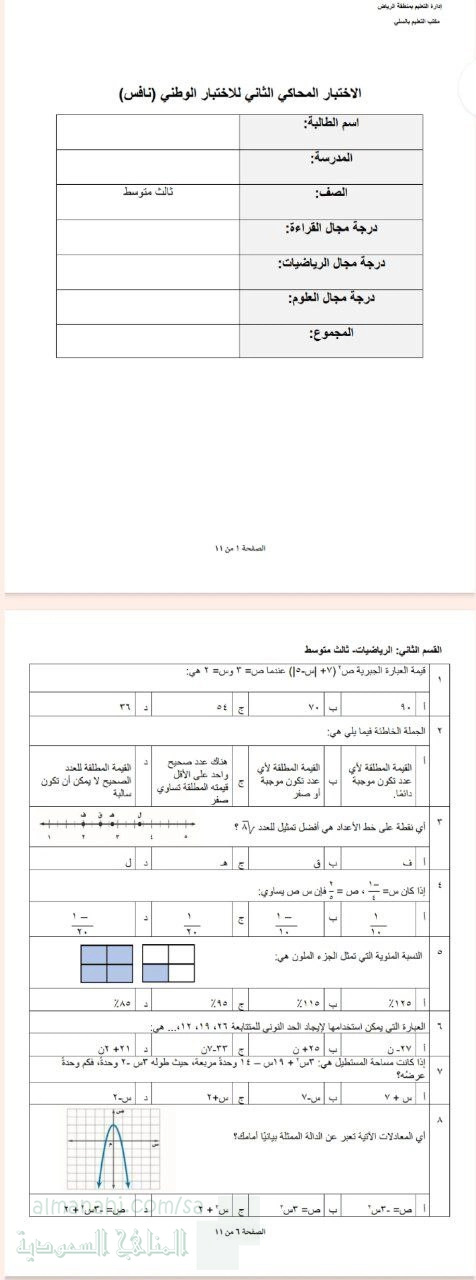 3. الصف الثالث المتوسط, رياضيات, نافس إجابة الاختبار المحاكي الثاني للاختبار الوطني 1446ه