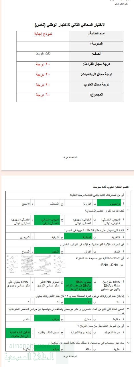 1. الصف الثالث المتوسط, علوم, نافس إجابة الاختبار المحاكي الثاني للاختبار الوطني 1446ه