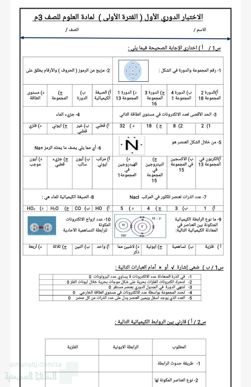 14. الصف الثالث المتوسط, علوم, اختبار الوحدة الرابعة الروابط والتفاعلات الكيميائية 1447ه غير محلول