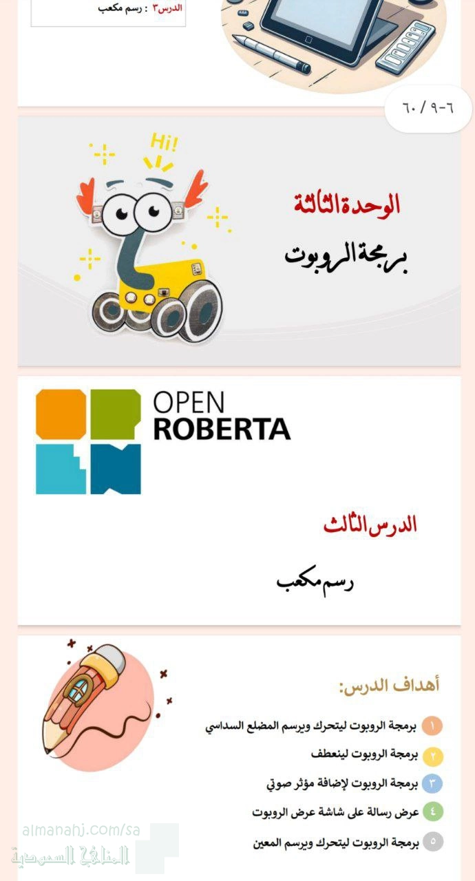 تم إيجاد الملف: عرض بوربوينت تقديمي للدرس الثالث رسم مكعب الوحدة الثالثة برمجة الروبوت لمقرر التقنية الرقمية