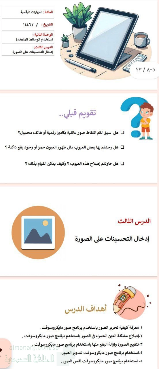 تم إيجاد الملف: عرض بوربوينت تقديمي للدرس الثالث ادخال التحسينات على الصورة الوحدة الثانية استخدام الوسائط المتعددة لمقرر التقنية الرقمية