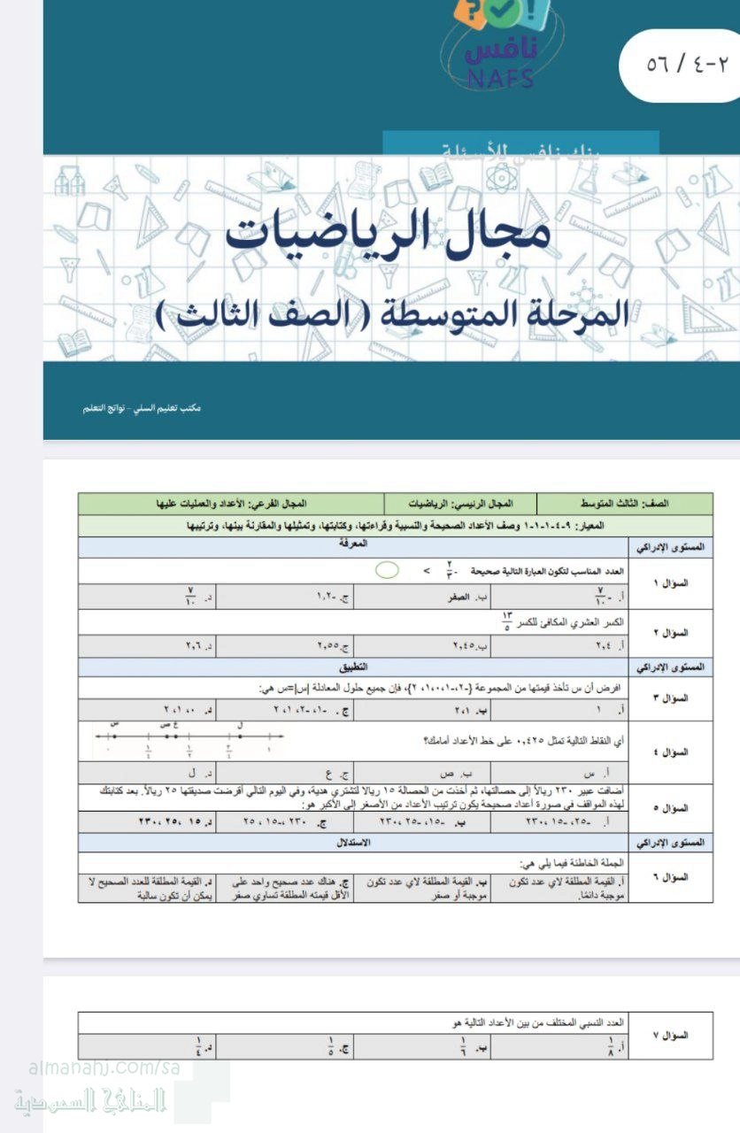 12. الصف السادس, رياضيات, تجميع نماذج تدريب محاكي لاختبار نافس تغطية شاملة للمعايير محلولة