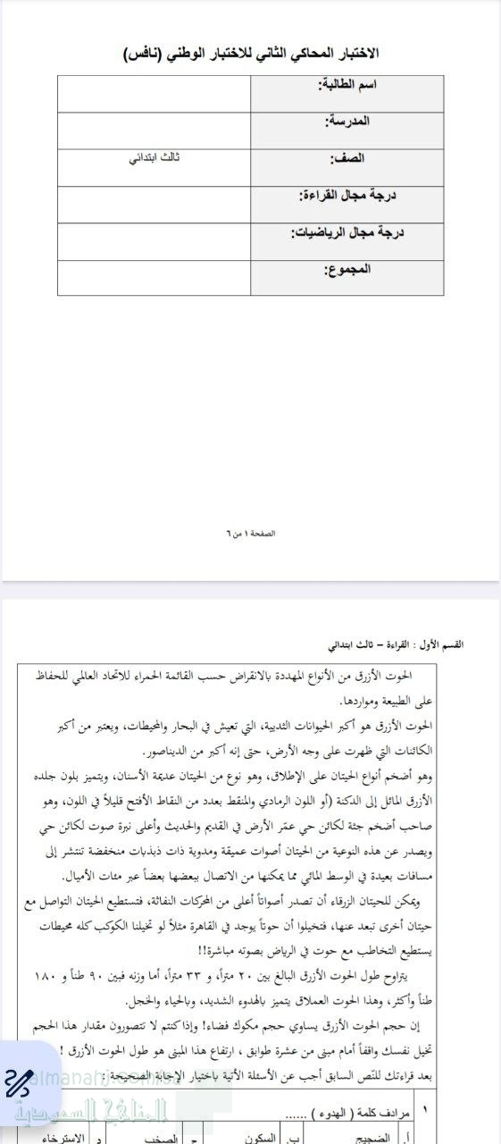 2. الصف الثالث, لغة عربية, نافس أسئلة محاكي للاختبار الثاني عن الحوت الأزرق محلول