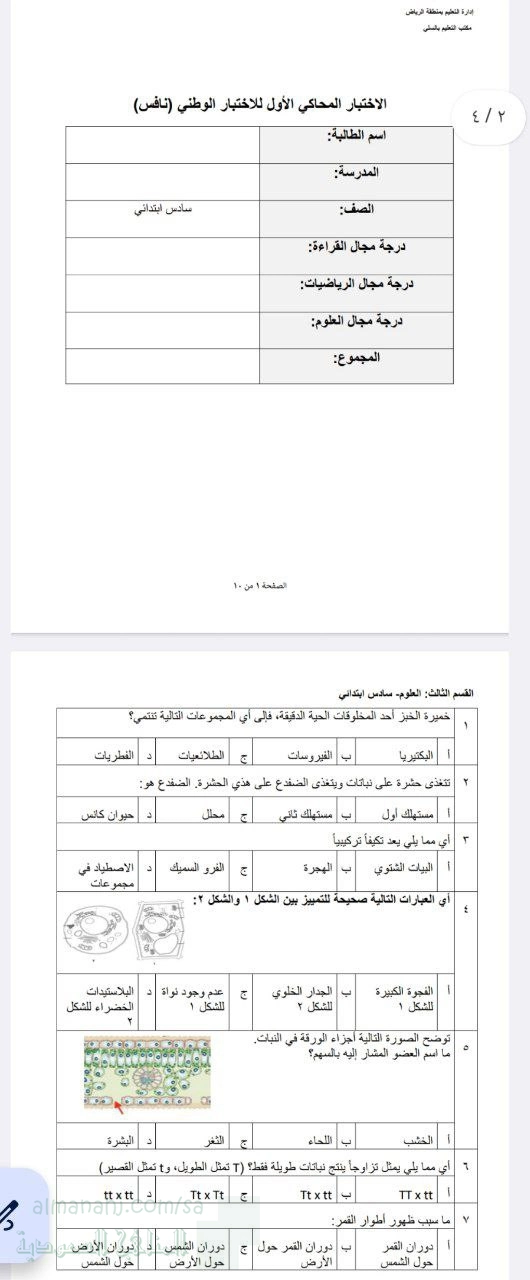 9. الصف السادس, علوم, إجابة أسئلة محاكية لاختبار نافس