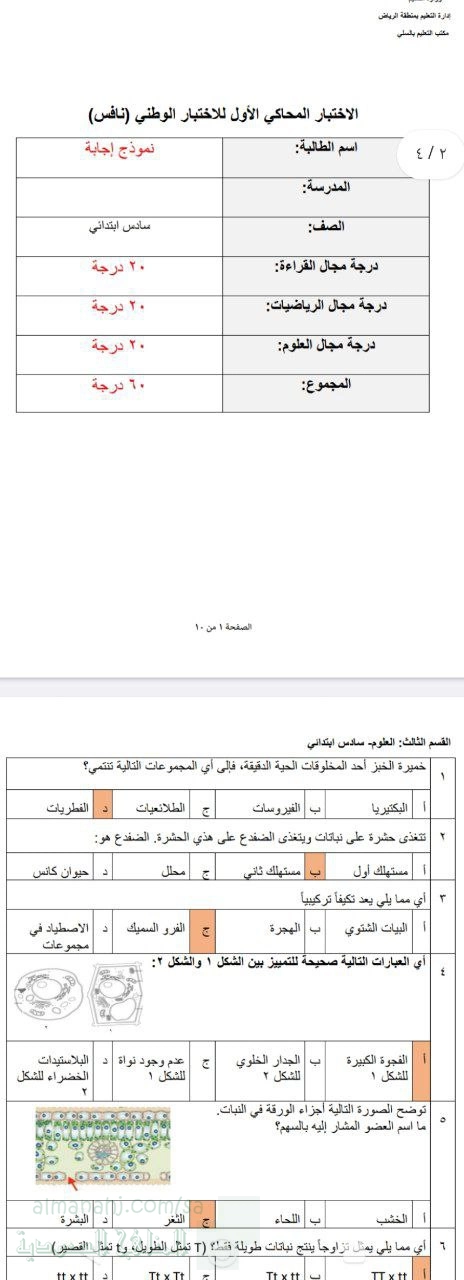 9. الصف السادس, علوم, إجابة أسئلة محاكية لاختبار نافس
