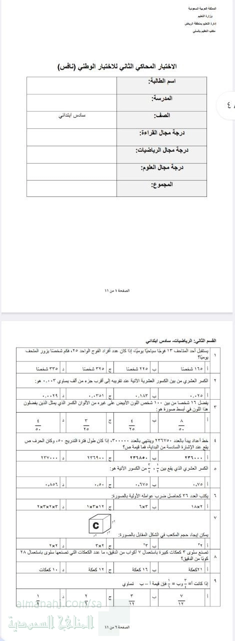 أسئلة محاكية لاختبار نافس الثاني غير محلول, الصف السادس, رياضيات, الفصل الثاني, 1447_1448 هجري - المناهج السعودية