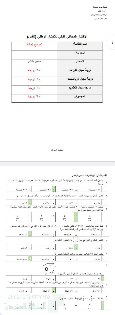 10. الصف السادس, رياضيات, أسئلة محاكية لاختبار نافس غير محلول