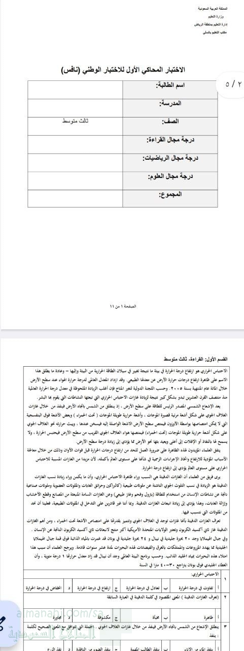 معلومات الملف: يحتوي هذا الملف على اختبار محاكي أول لنافس في مادة القراءة للصف الثالث المتوسط، حيث يدور النص حول ظاهرة الاحتباس الحراري وتعريفها وآلية حدوثها من خلال الإشعاع الشمسي وامتصاص الأشعة تحت الحمراء، وأهم الغازات الدفيئة مثل ثاني أكسيد الكربون، والأسباب البشرية والطبيعية المؤدية لهذه الظاهرة كالتلوث وحرق الغابات واستخدام الوقود الأحفوري، وانعكاساتها الخطيرة على البيئة مثل ذوبان الجليد وتكوين البحيرات الجليدية المهددة بالفيضانات. | ||