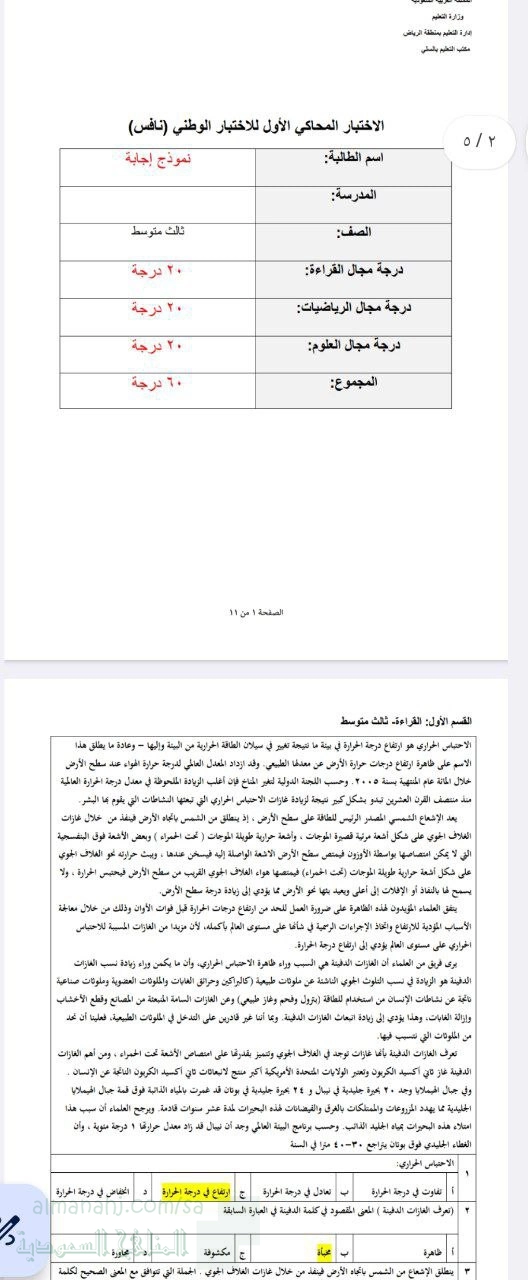 | نافس إجابة الاختبار المحاكي الأول يشمل ظاهرة الاحتباس الحراري وتعريفها وآلية حدوثها من خلال الإشعاع الشمسي وامتصاص الأشعة تحت الحمراء | ||
