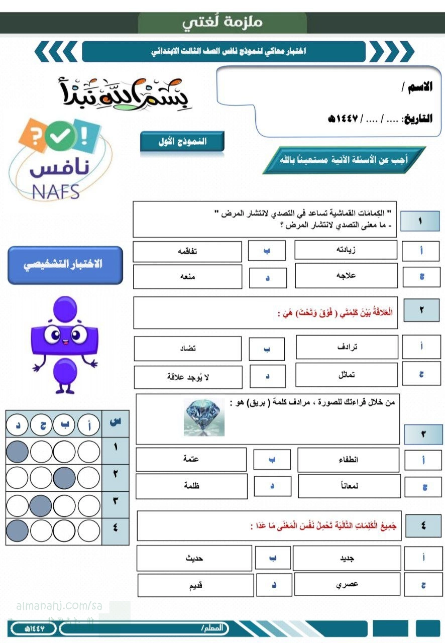 12. الصف الثالث, لغة عربية, ملزمة اختبارات نافس التجريبية غير محلولة1447ه