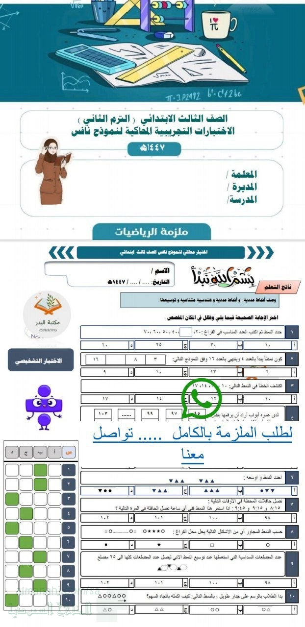 يحتوي هذا الملف على إجابات ملزمة اختبارات نافس التجريبية 1447ه‍، وهو في مادة الرياضيات للصف الثالث الإبتدائي وفق المنهاج السعودي.