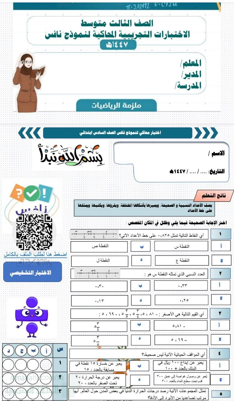 9. الصف السادس, رياضيات, ملزمة اختبارات نافس التجريبية غير محلولة1447ه