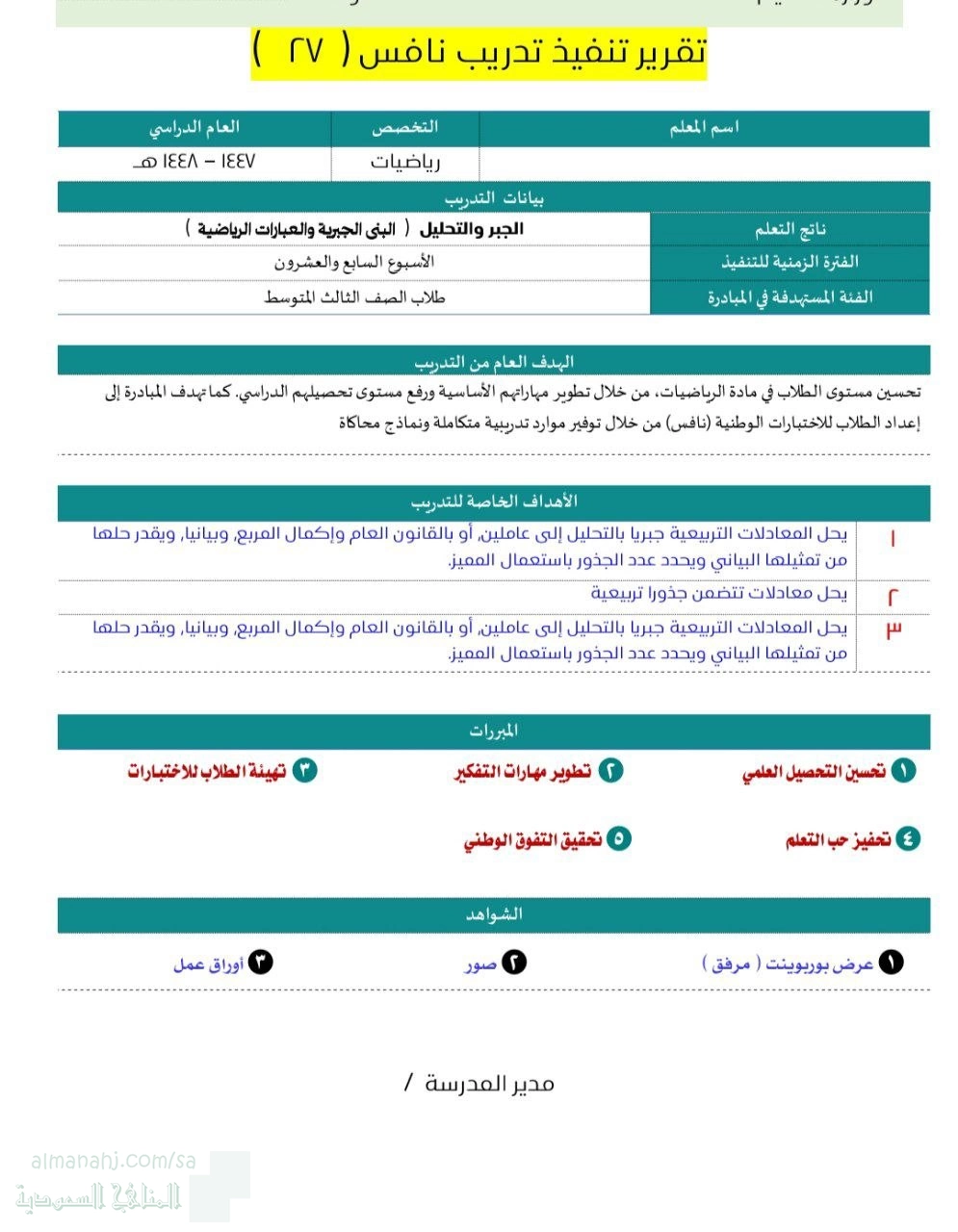 9. الصف الثالث المتوسط, رياضيات, تقرير تنفيذ تدريب نافس الإسبوع 27 في الجبر والتحليل الرياضي البنى الجبرية والعبارات الرياضية 1447ه