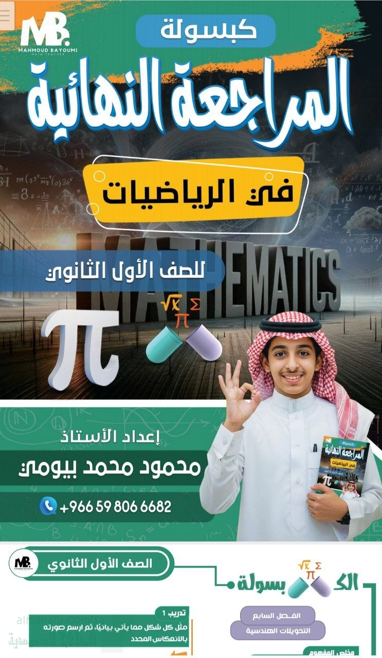 1. الصف الأول الثانوي, رياضيات, كبسولة المراجعة النهائية تضم التحويلات الهندسية والدوران