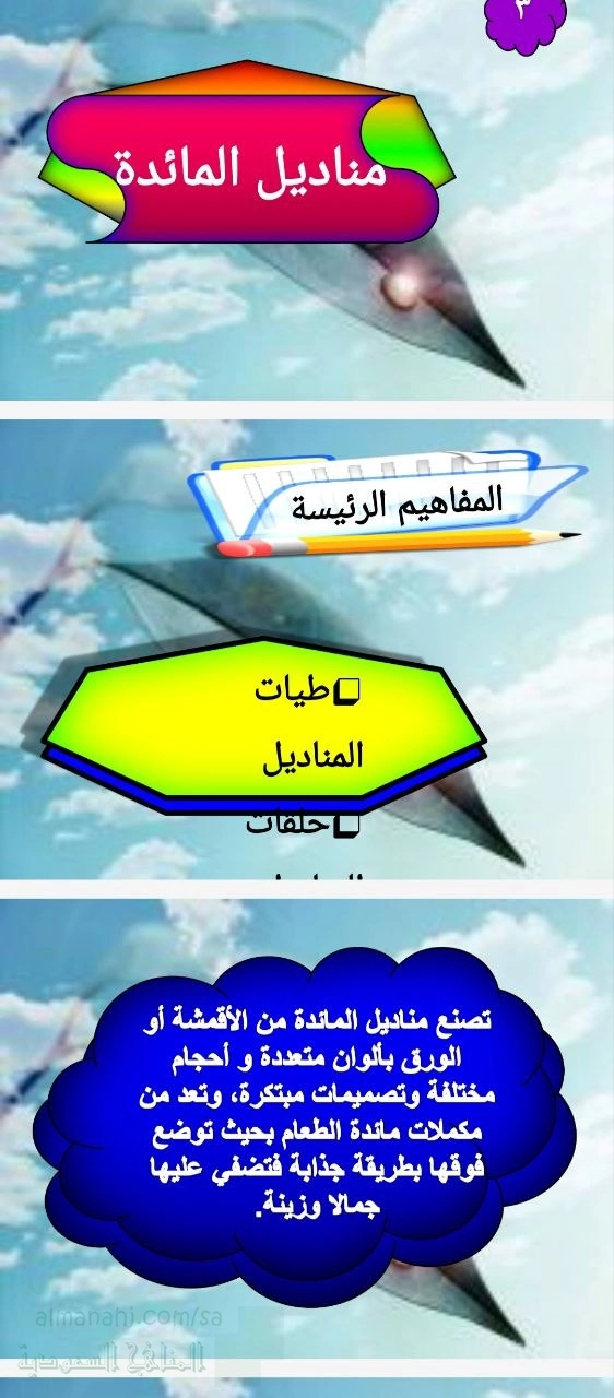 تربية أسرية بوربوينت درس مناديل المائدة أنواع الطيات وحلقات المناديل, الصف الأول المتوسط, تربية أسرية, الفصل الثاني, 1447_1448 هجري - المناهج السعودية