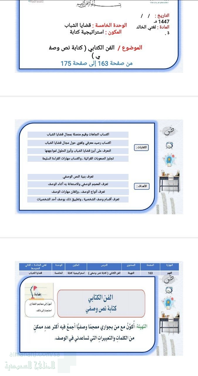 الوحدة الخامسة قضايا الشباب استراتيجية كتابة الفن الكتابي كتابة نص وصفي بحسب الصف الثاني المتوسط في مادة اللغة العربية – الفصل الثاني