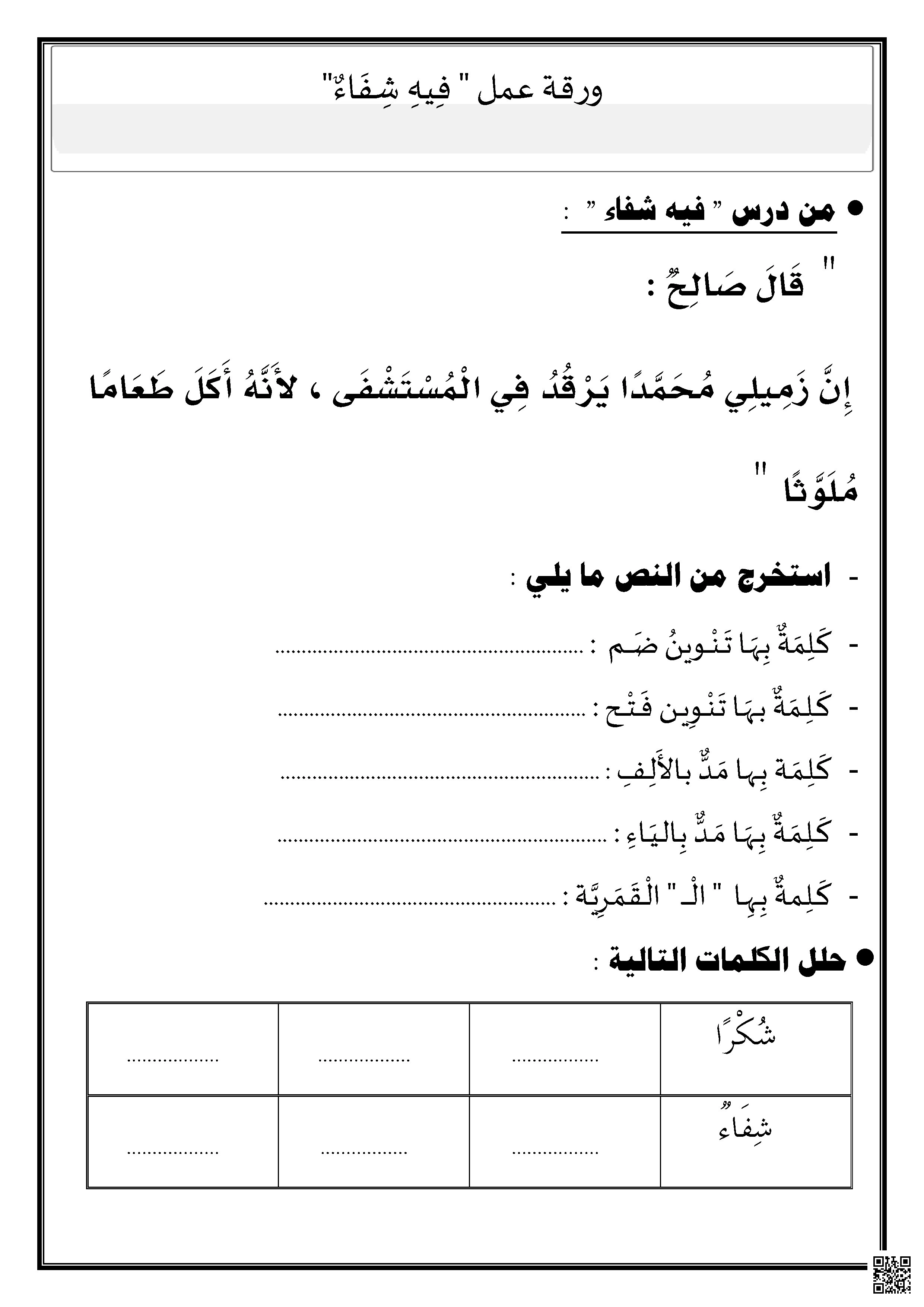 أوراق عمل لغوية من درس فيه شفاء غير محلول