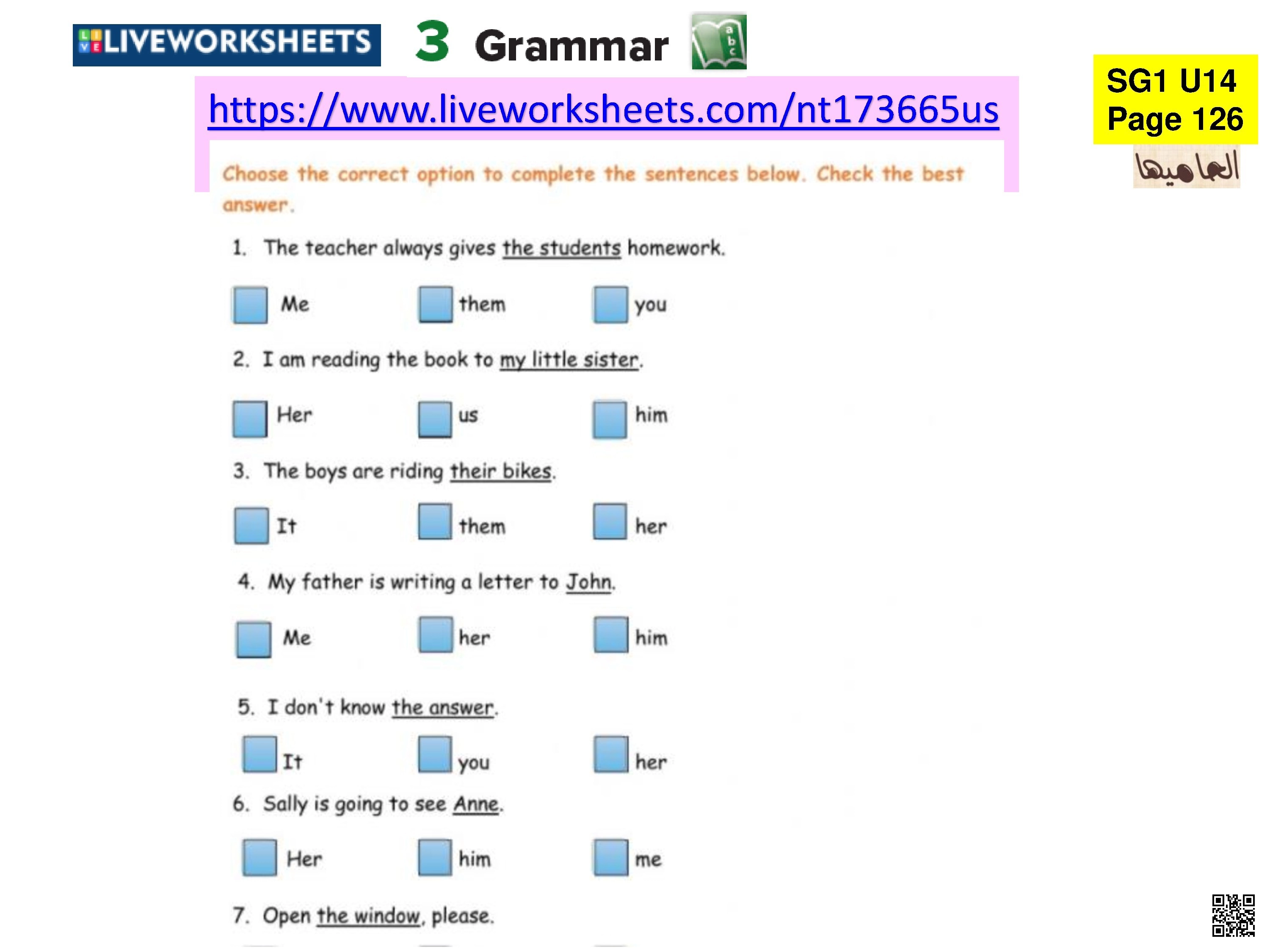 الدرس الثاني الوحدة14 ورقة عمل تفاعلية لتدريب ضمائر النصب في قواعد اللغة بحسب الصف الأول المتوسط في مادة اللغة الإنجليزية – الفصل الثاني