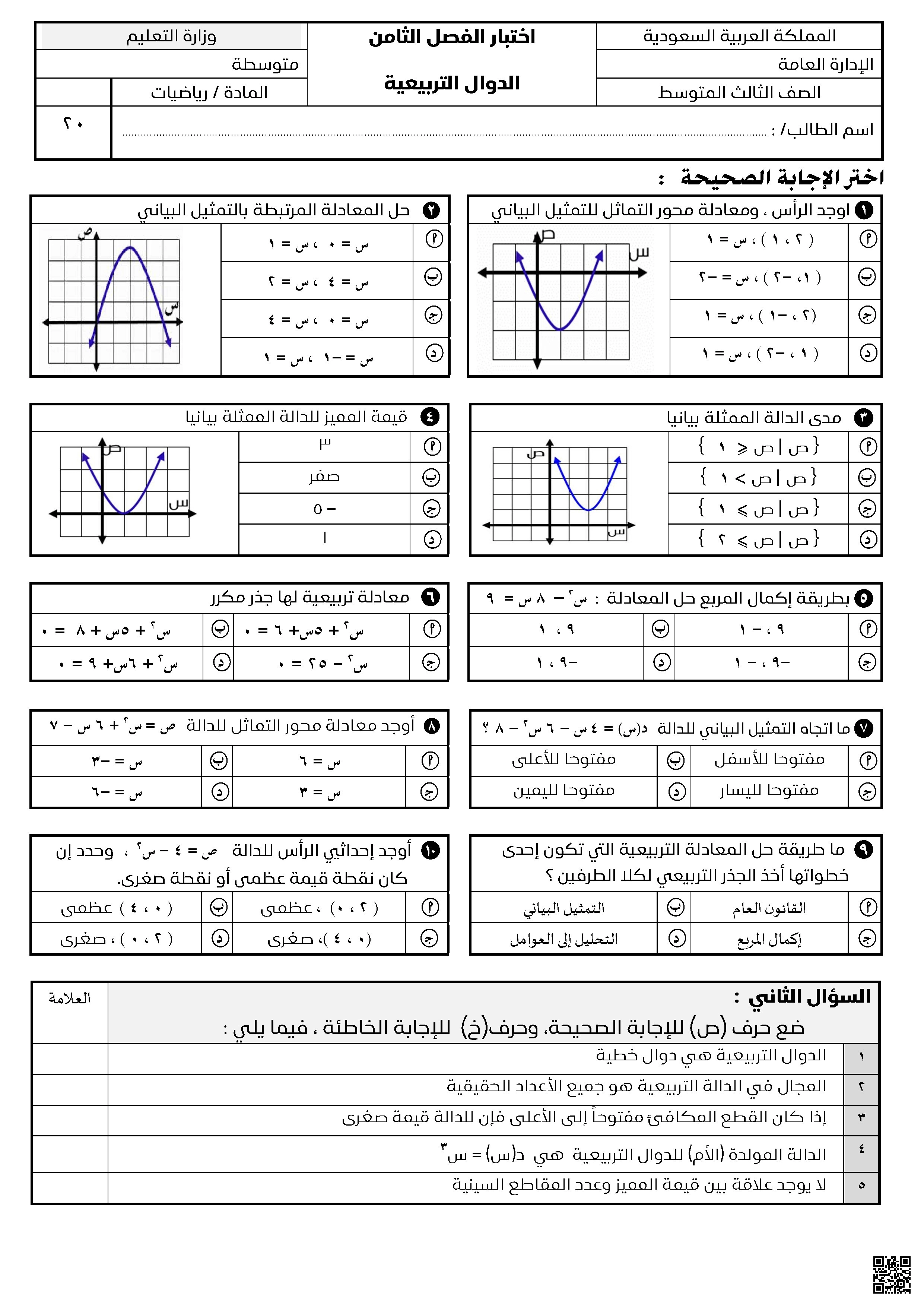 الأسئلة تغطي المفاهيم الأساسية للدوال التربيعي.