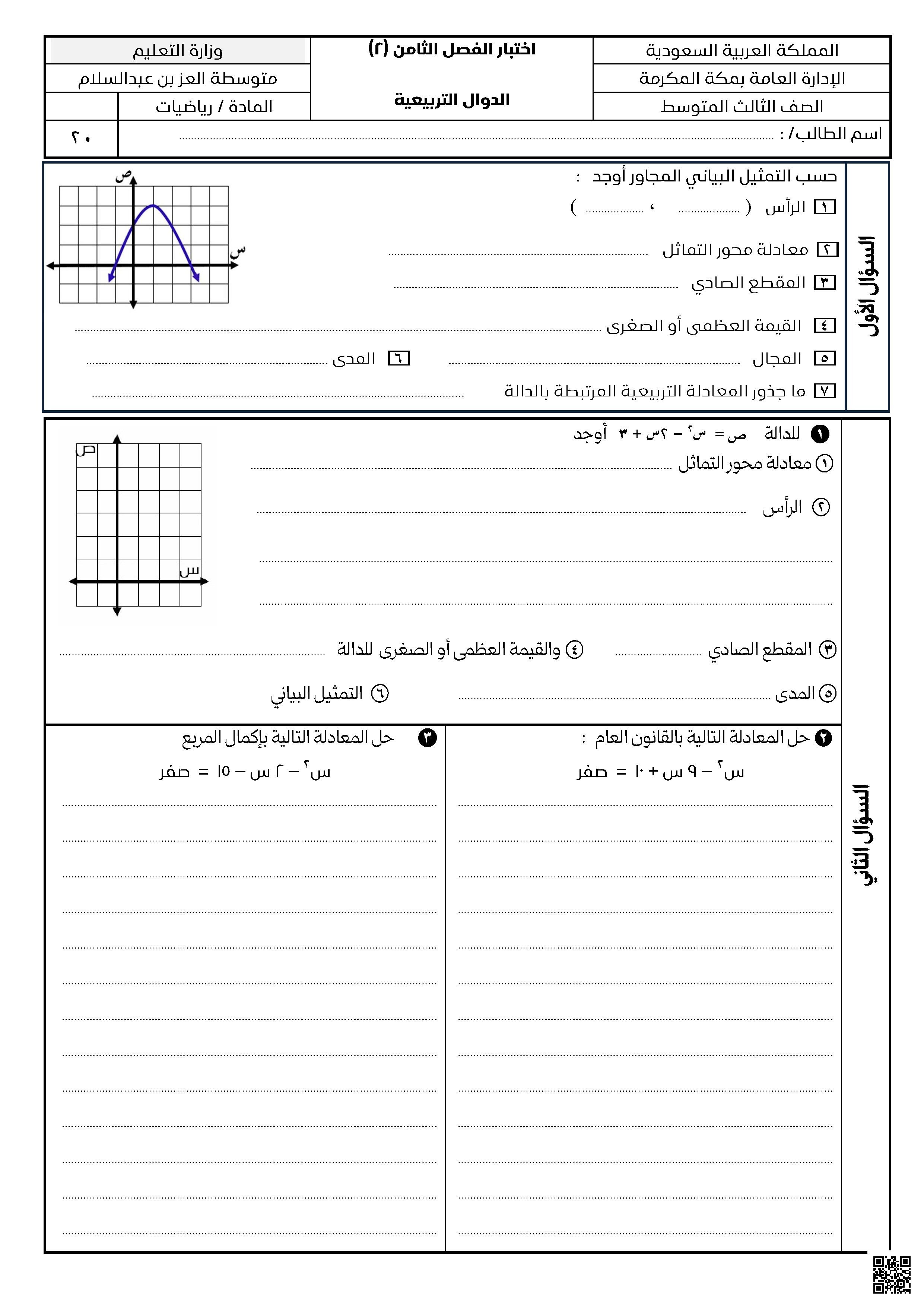 اختبار الفصل الثامن 2 في الدوال التربيعية غير محلول بحسب الصف الثالث المتوسط في مادة الرياضيات – الفصل الثاني