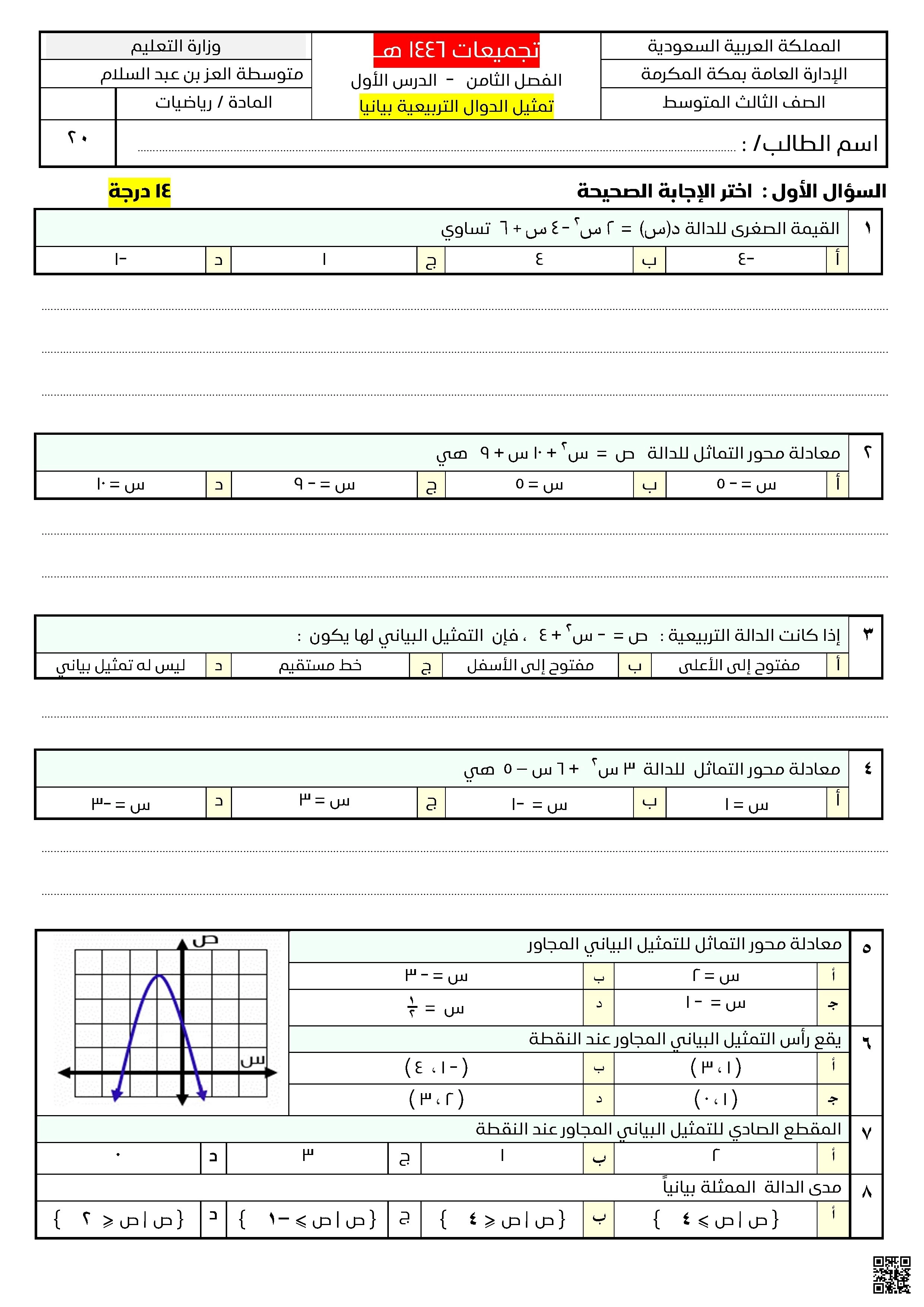 تجميعات أسئلة الدرس 8-1 تمثيل الدوال التربيعية بيانياً 1446ه‍ غير محلول