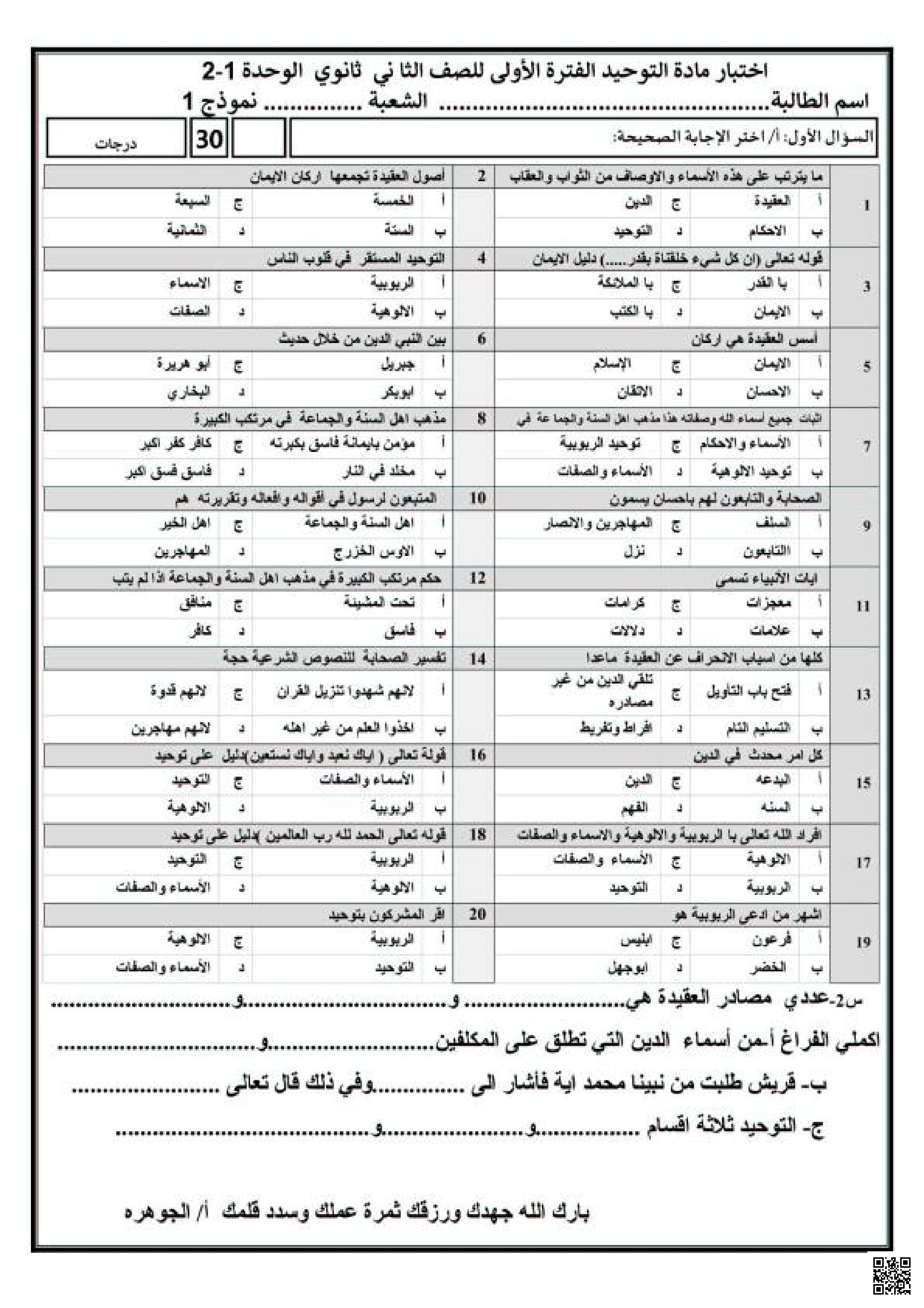 اختبار الفترة الأولى في التوحيد حول أصول العقيدة وأقسامها 1447ه‍ مع نموذج الإجابة بحسب الصف الثاني الثانوي في مادة دراسات اسلامية – الفصل الثاني