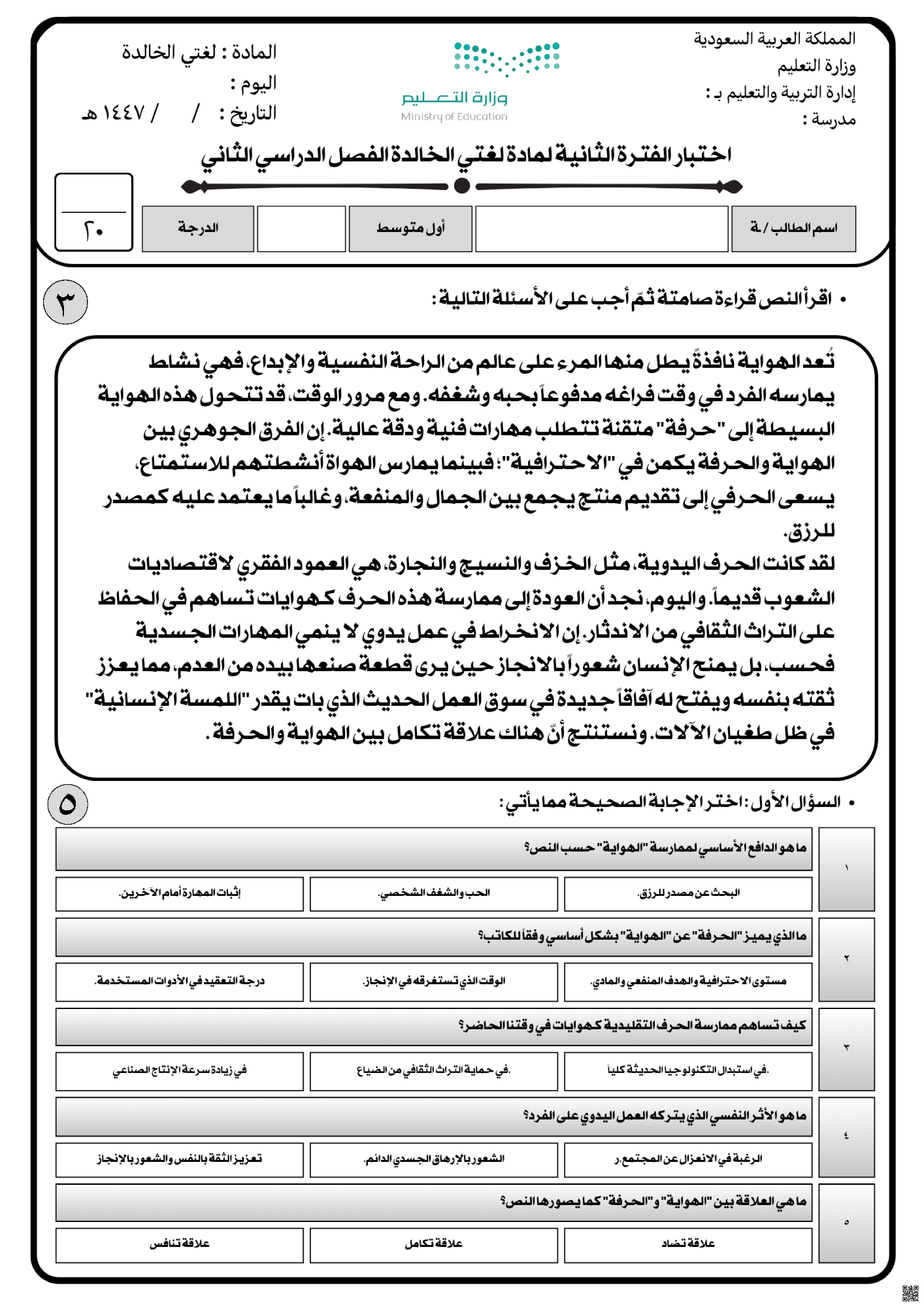 اختبار الفترة الثانية حول مبادرة السعودية الخضراء وتحلية المياه 1447ه غير محلول