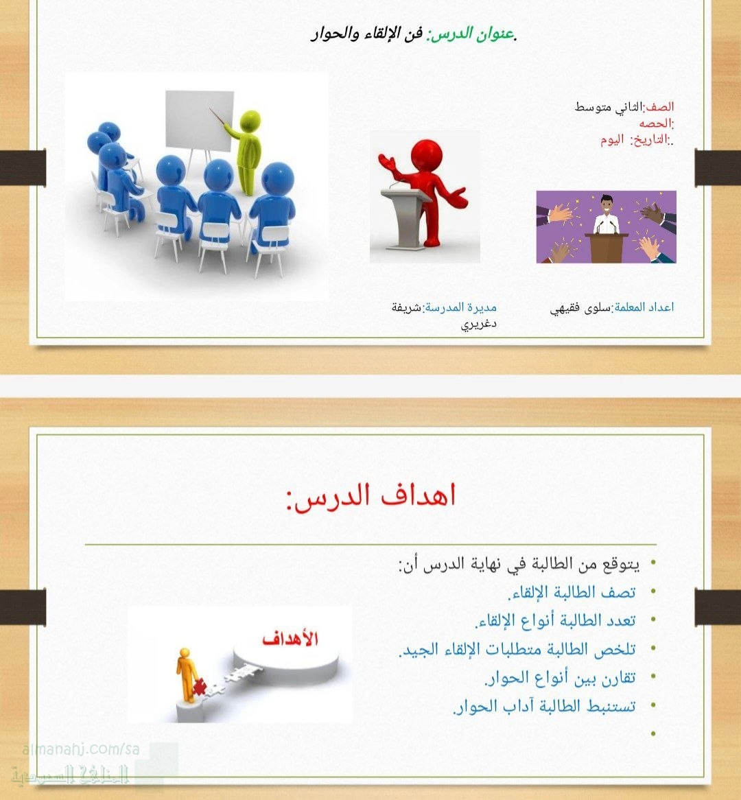 يحتوي هذا المقال على درس فن الالقاء والحوار، وهو في مادة التربية الأسرية للصف الثاني المتوسط وفق المنهاج السعودي.