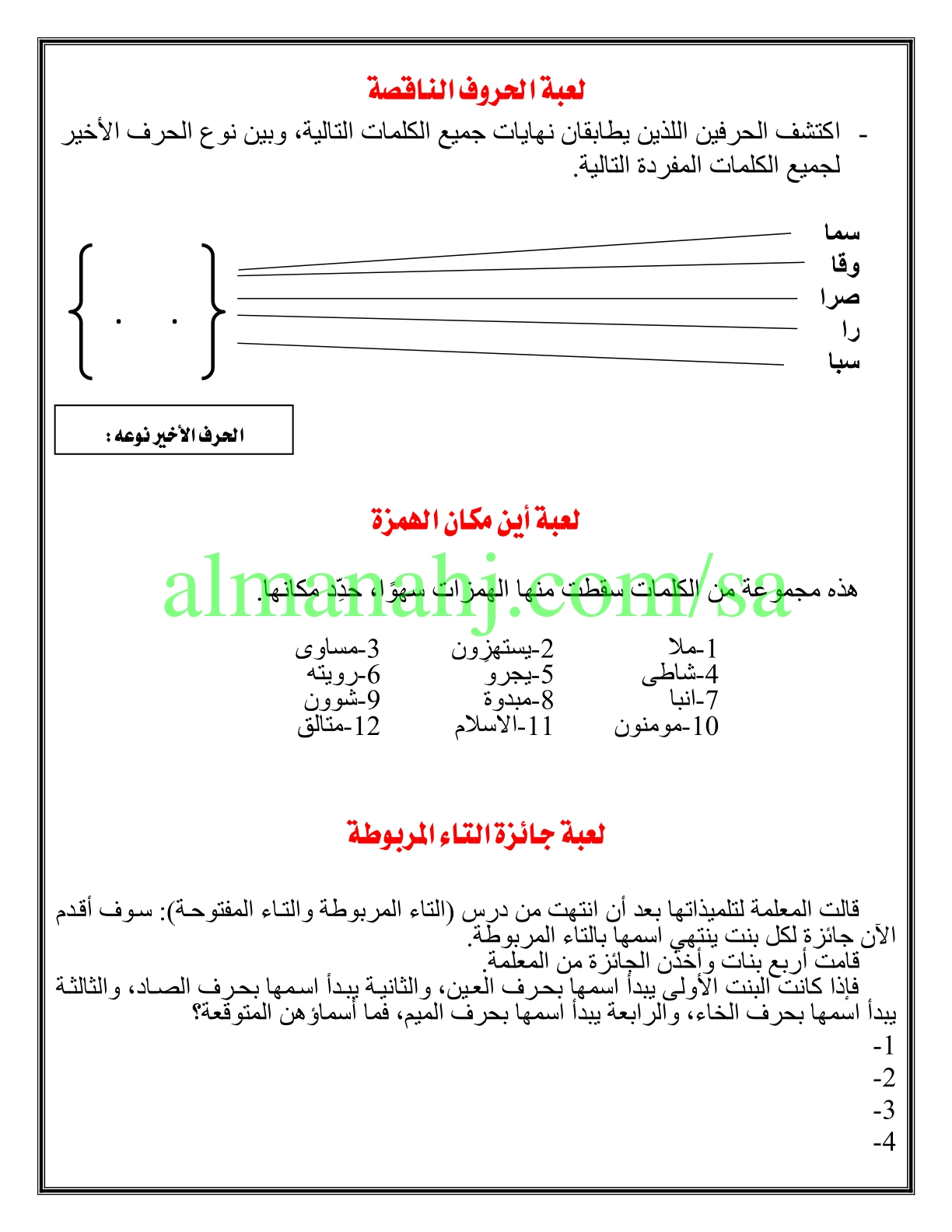 إليكم رابط ملف ألعاب وتدريبات ومناشط املائية للمرحلة الابتدائية بطرق واساليب متعددة شيقة للطلاب مثل لعبة كلمة السر  والكلمة المختلطة والكلمات الناقصة وغيرها