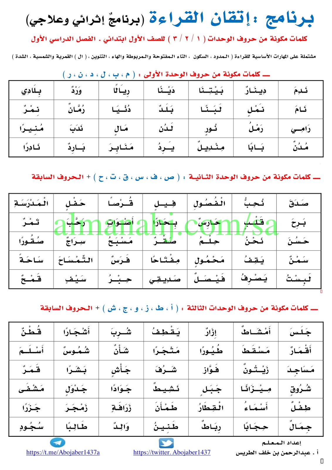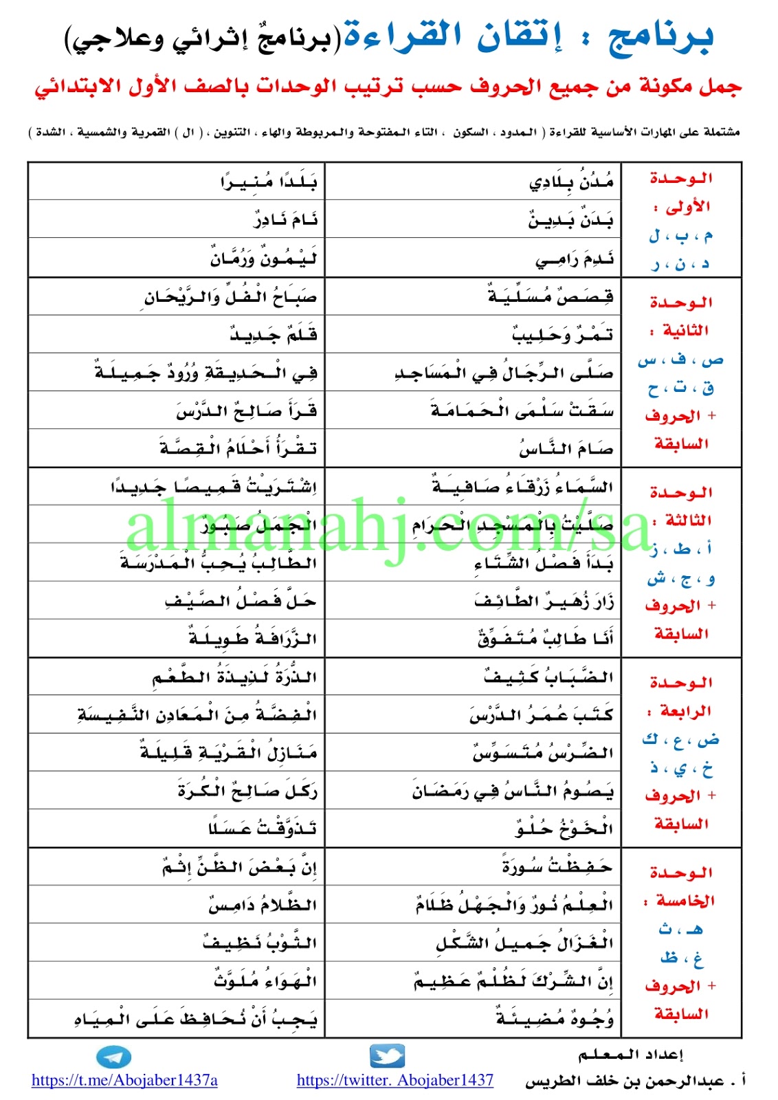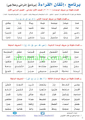 برنامج اثرائي وعلاجي لاتفان القراءة لطلاب الصف الأول الابتدائي ويتضمن كلمات وجمل حسب ترتيب الوحدات