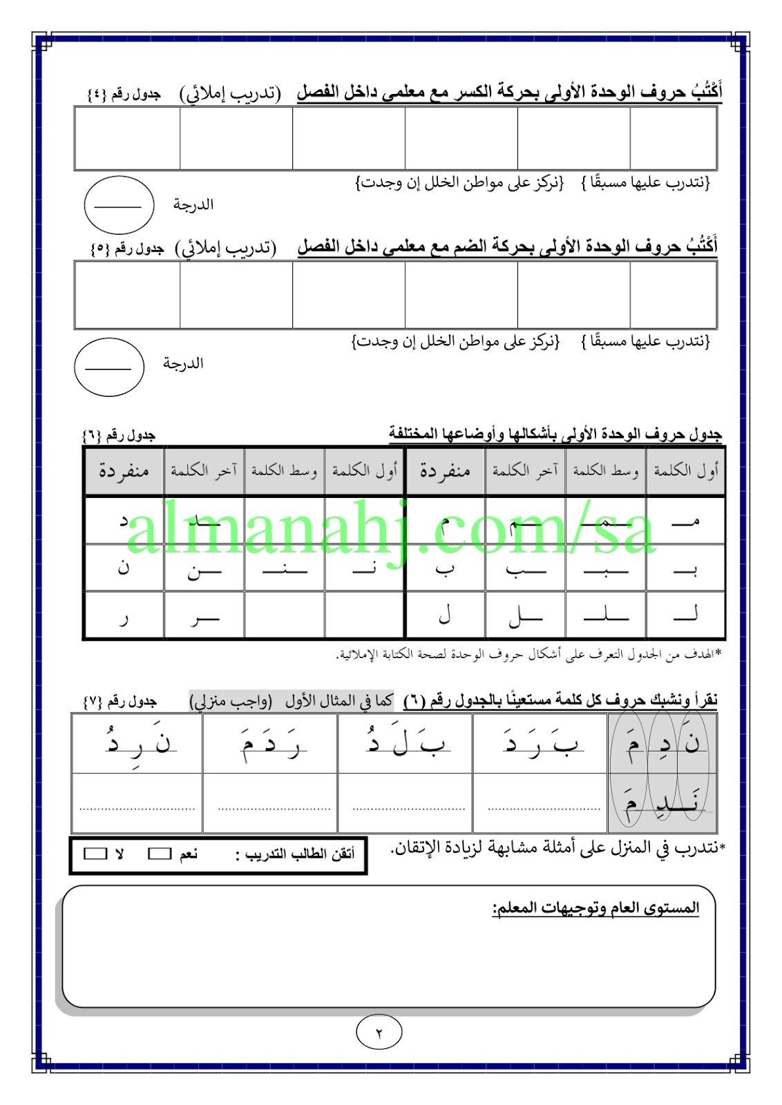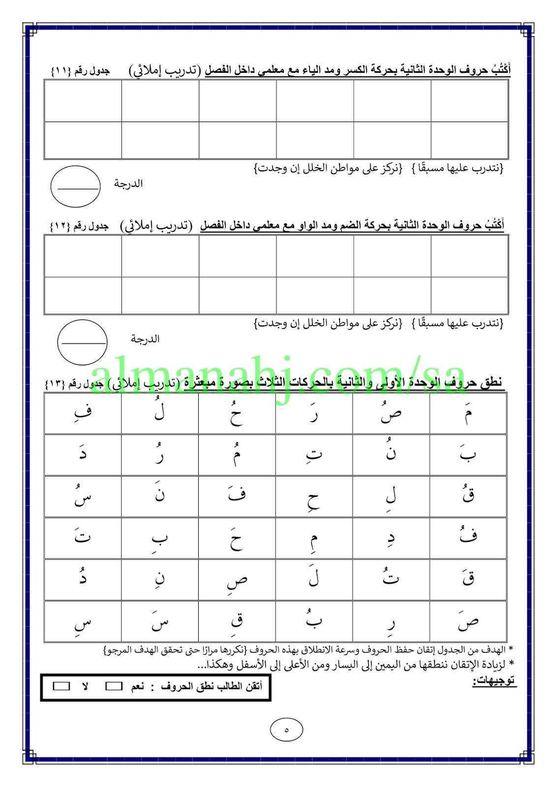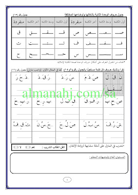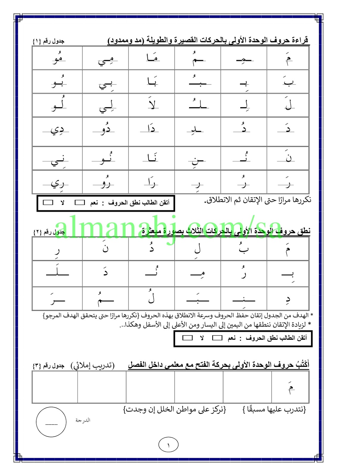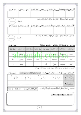 10. لغة عربية, الفصل الأول, 1447_1448, أوراق عمل تدريبية لحروف الوحدة الأولى أسرتي