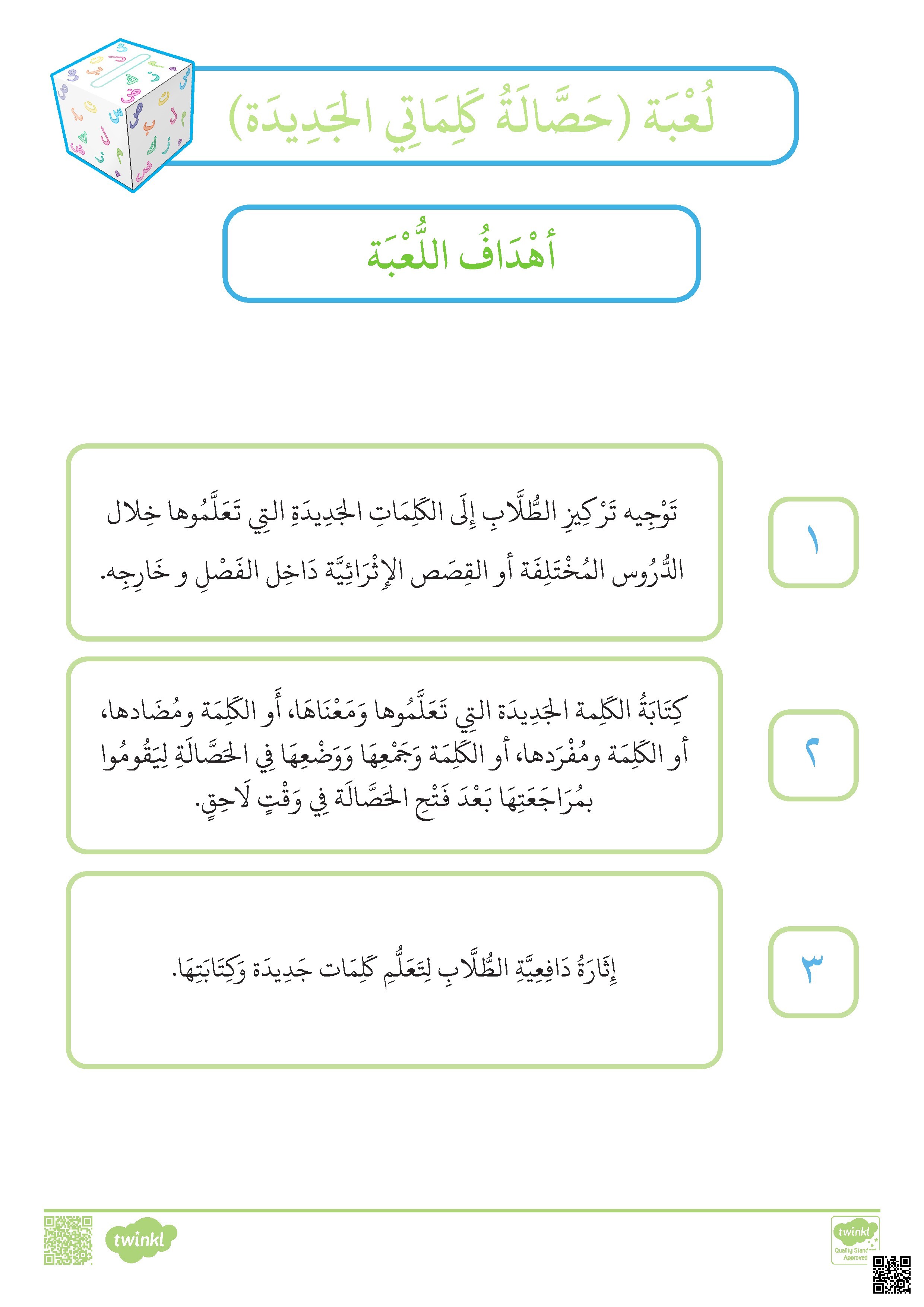 يقدم الملف نشاطاً تعليمياً عبارة عن حصالة ورقية يجمع فيها الطالب بطاقات الكلمات الجديدة التي تعلمها، مع نماذج لكتابة الكلمة ومعناها، أو ضدها، أو مفردها، أو جمعها. يتضمن الملف أهداف اللعبة وخطواتها، وصفحات متعددة لقص البطاقات وتصنيفها (معنى، ضد، مفرد، جمعمما يشجع على المراجعة الذاتية وإثراء الرصيد اللغوي بأسلوب تفاعلي ممتع.
