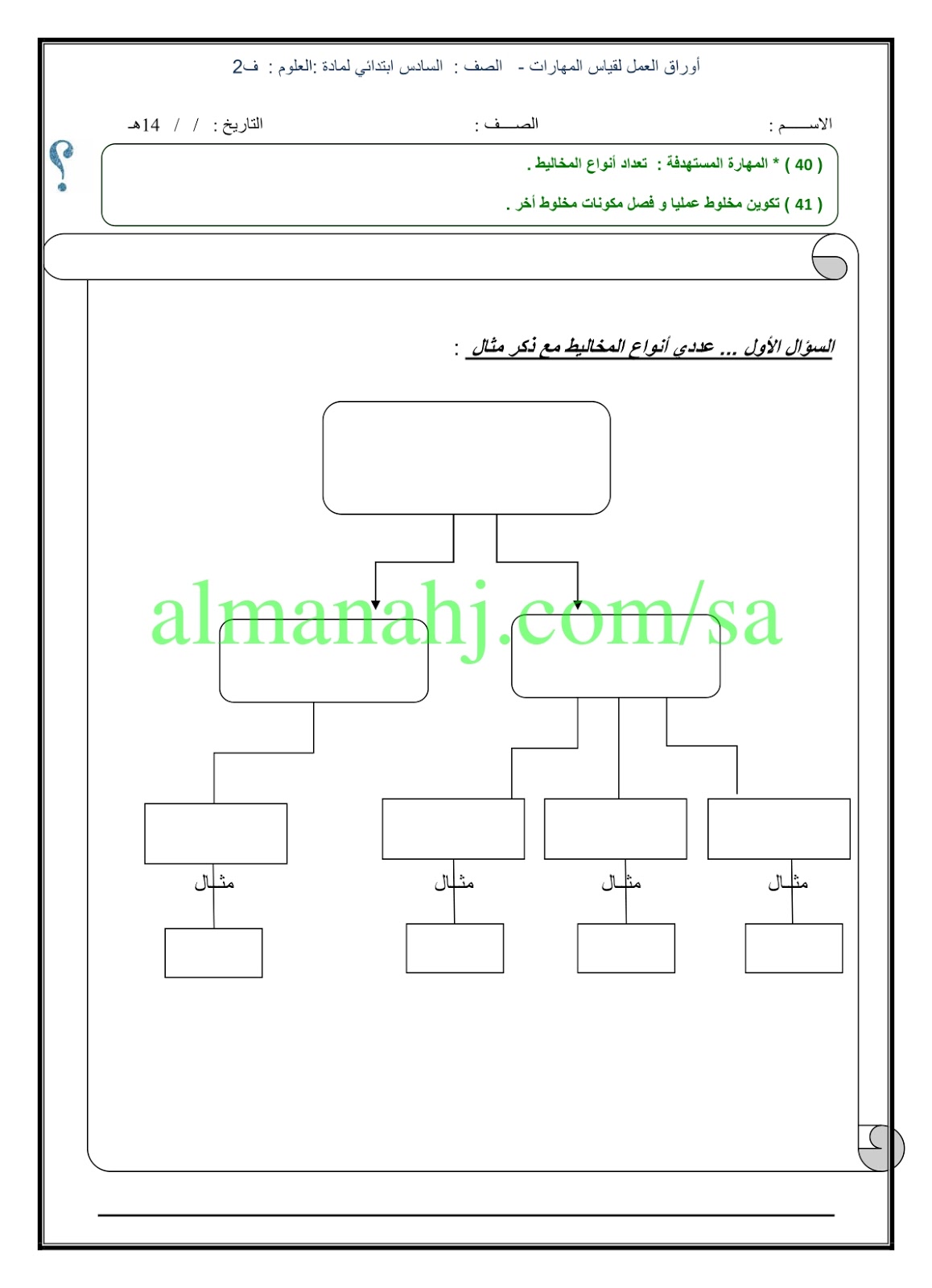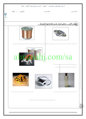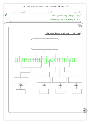 ملف يتضمن أوراق عمل لمادة العلوم للصف السادس الابتدائي لقياس مهارات مادة العلوم