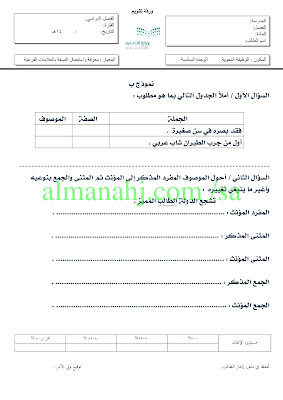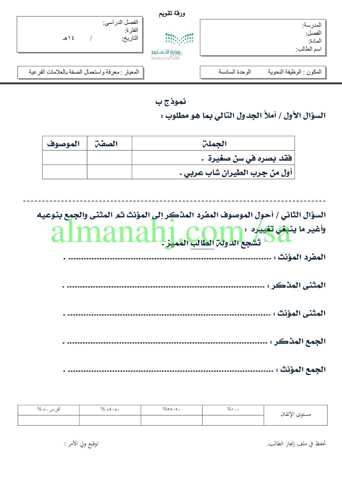 إليكم رابط ملف يحوي ورقة عمل للوحدة السادسة لمادة اللغة العربية للصف الخامس الابتدائي نموذج ب ويتضمن يتضمن معيار معرفة و استعمال الصفة بالعلامات الفرعية
