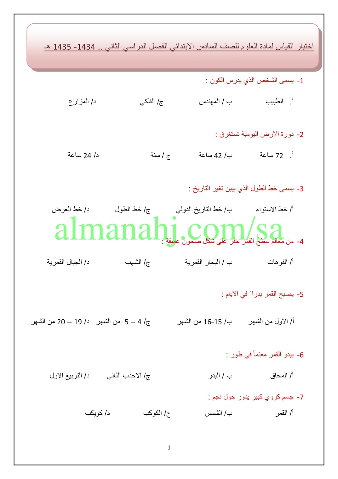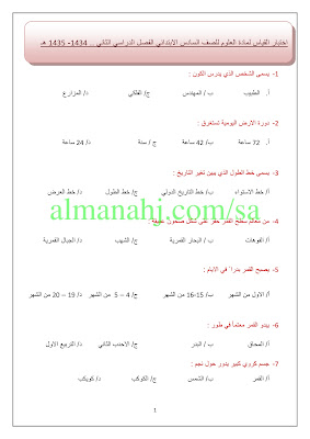 1. الصف السادس, رياضيات, اختبار منتصف الفصل الأول 1447ه