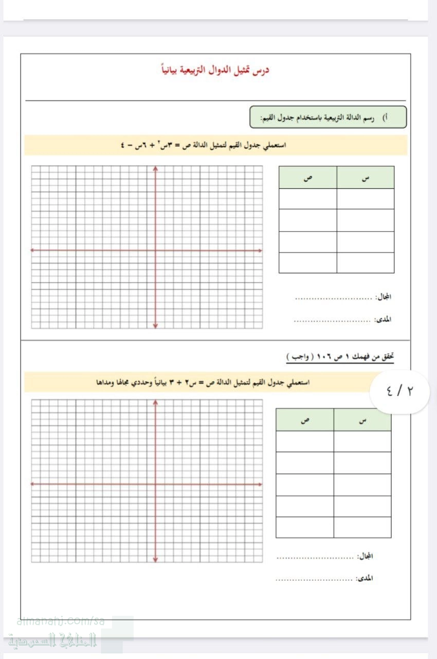 ورقة عمل تمثيل الدوال التربيعية بيانياً
