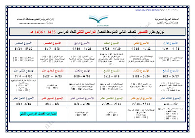 توزيع مقرر التفسير للصف الثاني متوسط وفق المنهج السعودي للفصل الدراسي الثاني عام1436