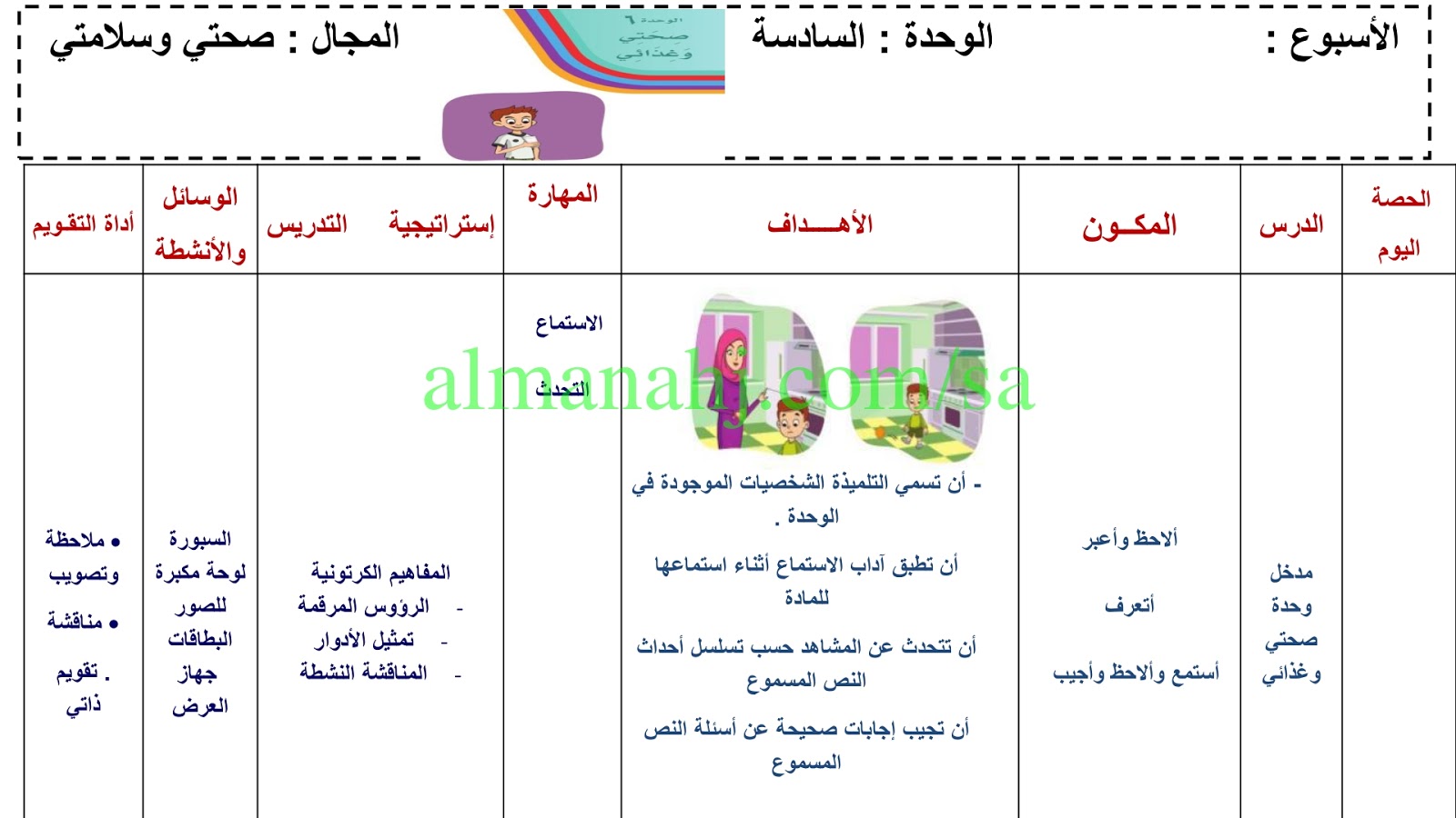 معلومات الملف: إليكم ملف للوحدة السلدسة من مقرر لغتي للصف الأول الابتدائي ويتضمن طريقة تحصير الدرس بشكل مفصل وتحديد المكون والأهداف والمهارة واستراتيجية الدرس والوسائل والانشطة وأداء التقويم لكل درس | ||