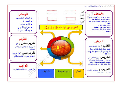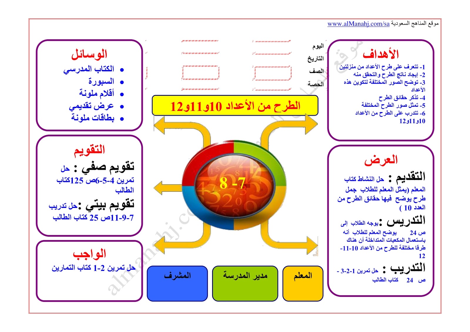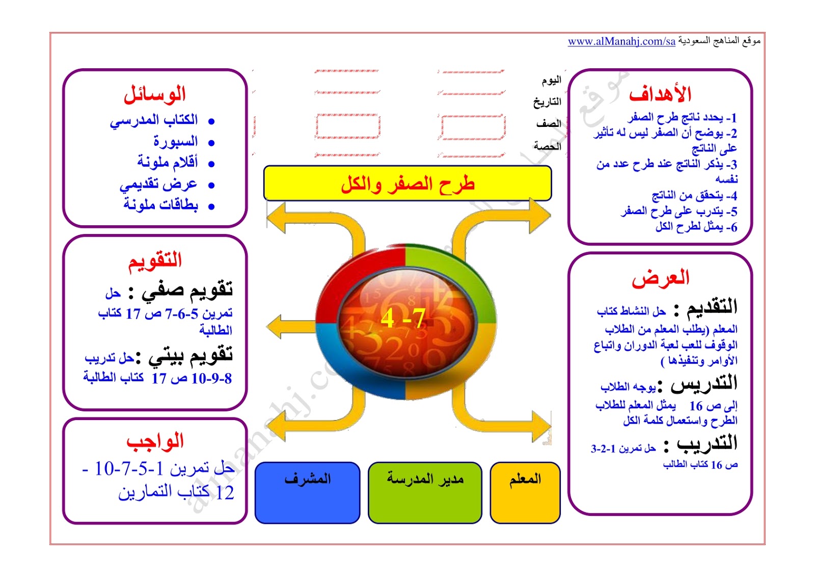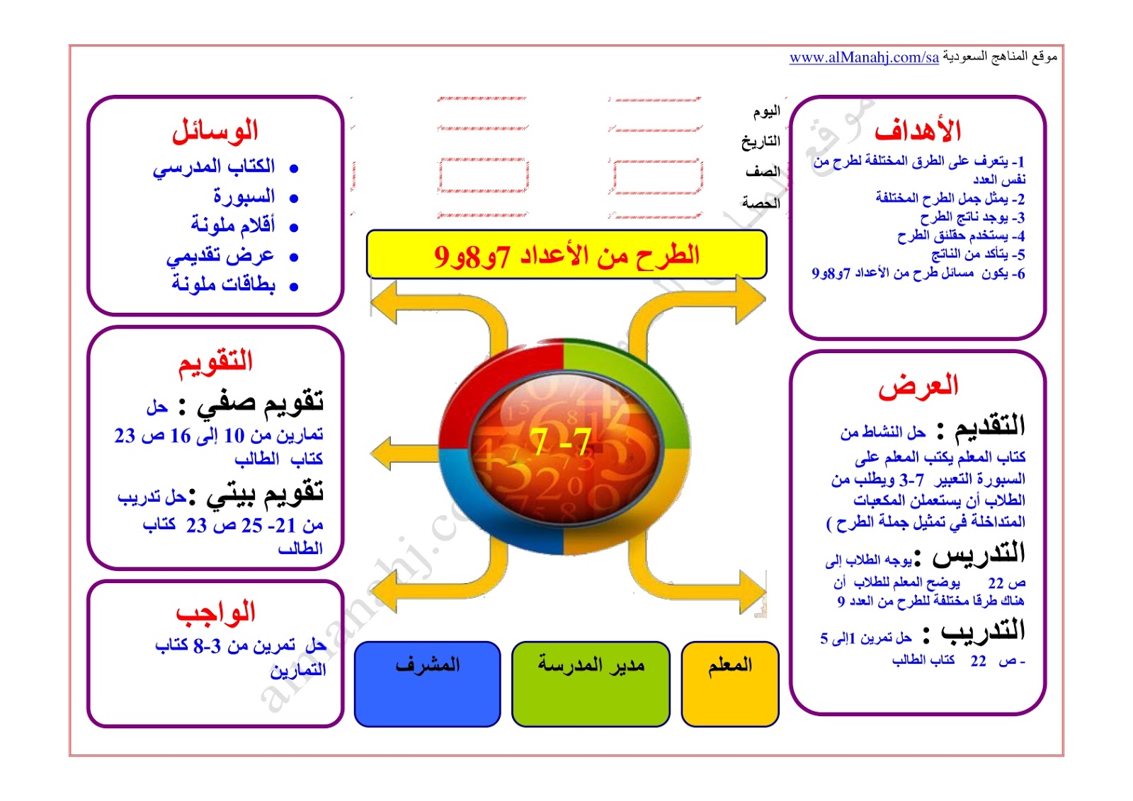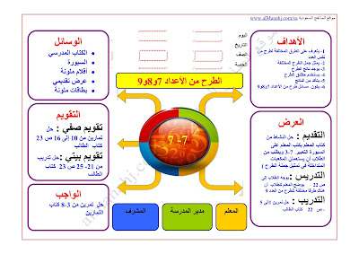 ملف للمدرسين يتضمن تحضير مقرر الرياضيات للصف الأول الابتدائي حيث يوضح ويحدد الاهداف والعرض والوسائل والتقويم والواجب من كل درس