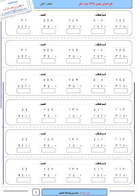 ورقة عمل مميزة في مادة الرياضيات للصف الثاني الابتدائي تتناول موضوع جمع عددين ضمن العدد 999 بدون حمل