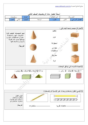 أسئلة اختبار في مادة الرياضيات للصف الثاني الابتدائي تتناول موضوع المجسمات بطريقة سهلة وواضحة