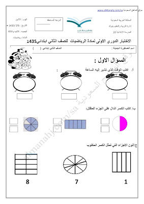 إليكم ملف يحوي الاختبار الدوري الأول للصف الثاني الابتدائي في مادة الرياضيات وتتنوع الاسئلة بين المقارنة بين كسرين وكتابة العدد بالكلمات وكتابة الوقت وغيرها