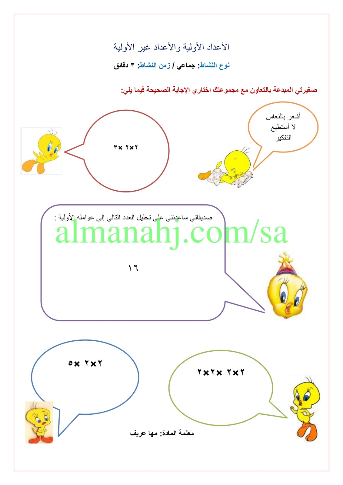 معلومات الملف: نشاط جماعي لطلاب الصف الخامس الابتدائي في مادة الرياضيات باسلوب مشوق يعتمد على الرسوم الكرتونية | ||