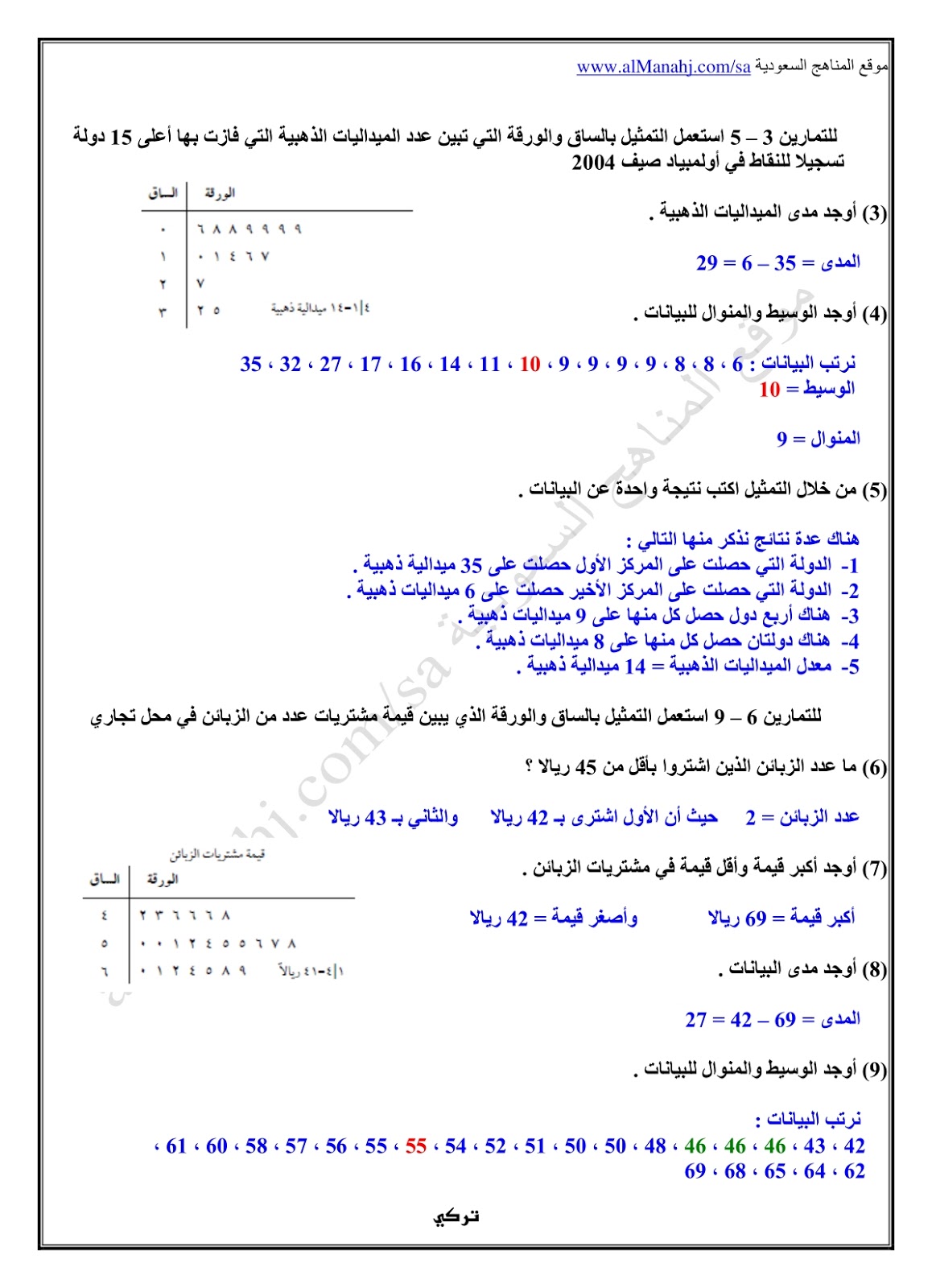 حل كتاب النشاط لدرس التمثيل بالساق و الورقة في  مادة الرياضيات للصف الأول المتوسط وفق المنهج السعودي