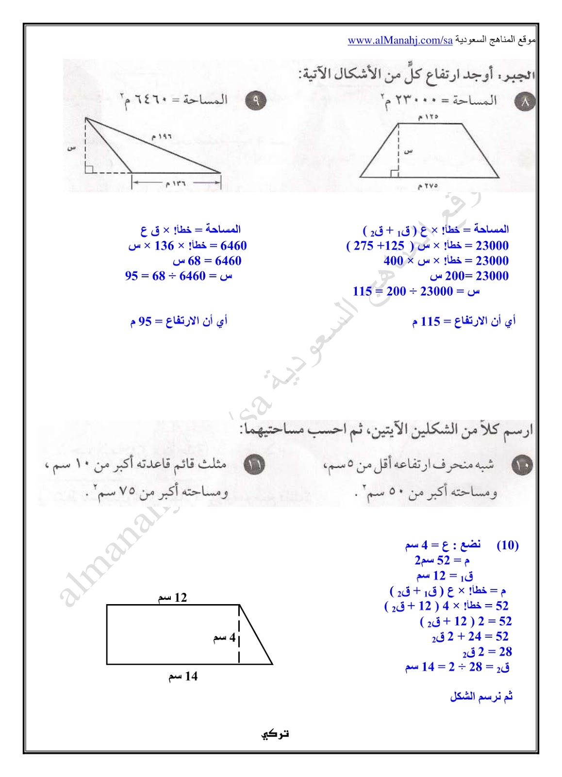 حل كتاب النشاط لدرس مساحة المثلث و شبه المنحرف في  مادة الرياضيات للصف الأول المتوسط وفق المنهج السعودي