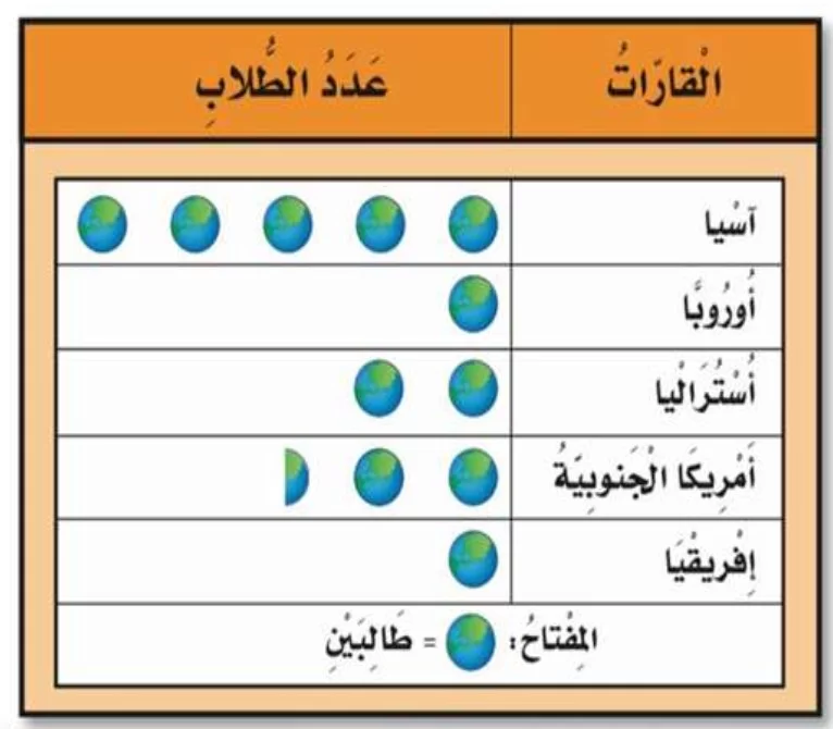 بناءً على مفتاح التمثيل في الجدول (المفتاح: كل صورة تمثل طالبين)، وبما أن قارة أستراليا بجانبها صورتان، فإن عدد الطلاب هو \(2 \times 2 = 4\) طلاب.