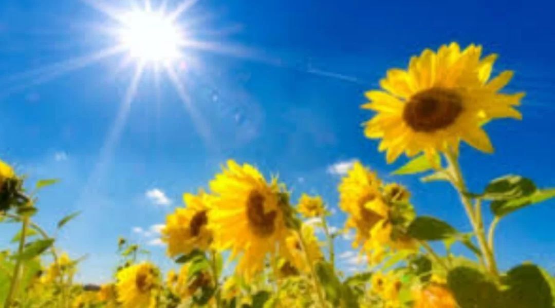 The image displays bright sunlight and flowers, which is characteristic of sunny weather.