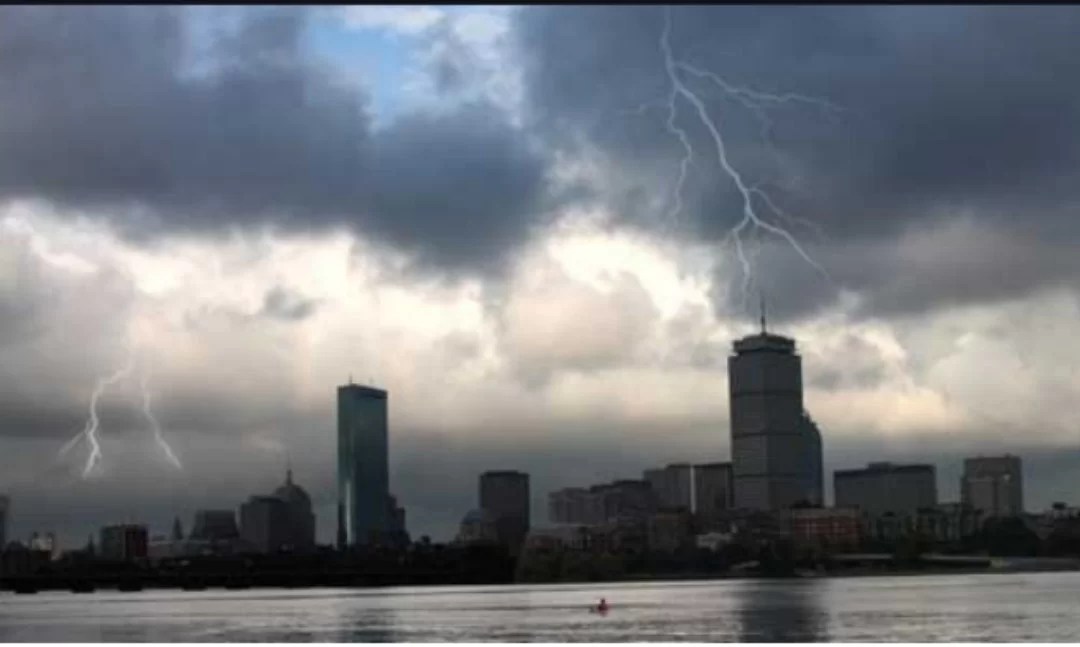 The image shows lightning and dark clouds, which are signs of a stormy day.